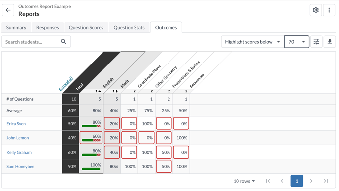 You can highlight outcome scores to quickly spot areas of strength or concern: