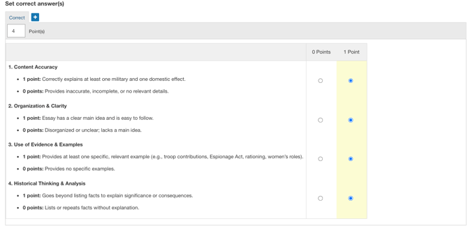 - Create one question per criterion, each with its own point value distribution.