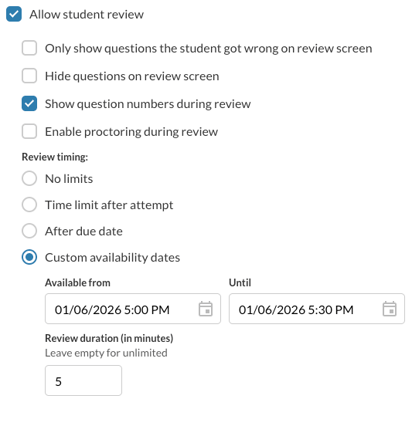 When allowing Student Review you can set custom time limits to control the access.