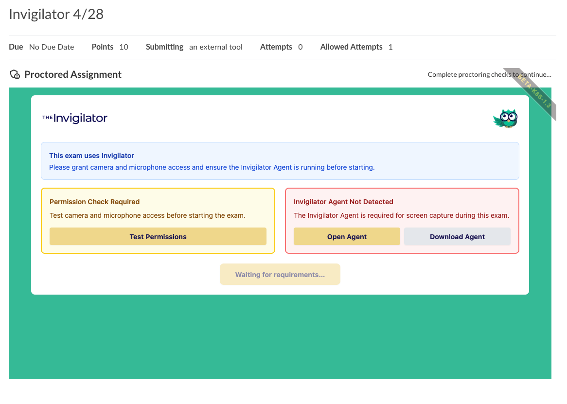 The panel displays Waiting for requirements... until both checks pass. Once all requirements are satisfied, the student may proceed.