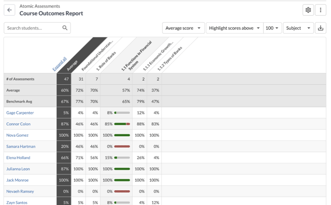 This teacher-facing report aggregates outcome scores across all assessments for all students in a course. This report is similar to the single assessment student outcome report, but scores are aggregated across the entire course rather than a single assessment.