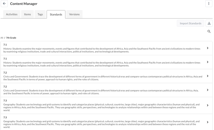 You can download a CSV containing the hierarchy available in the Standards tab. In a future release, you will be able to make changes to the CSV and import to apply changes globally to the hierarchy. The CSV format is case sensitive.